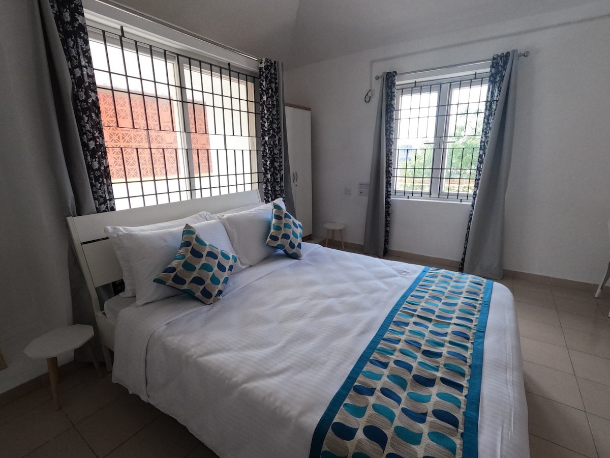 Un allotjament de 2 habitacions recentment renovat amb aire condicionat, mobles de bon gust, il·luminació, equipaments nous al cor de la ciutat, una ubicació tranquil·la i residencial. Aspirem a oferir una estada agradable, neta i assequible. Sala: sofà, divan, TV LED de 43", DTH, wifi Menjar: taula de 4 places amb espai de treball Dormitori (2): 2 llits de mida queen, 2 matalassos de terra, aire condicionat, penjador de bressol de finestra Cuina: nevera, fogons d'inducció, estris bàsics Bany (2): sabó líquid, dutxa, vàters occidentals Serveis: rentadora, UPS, estenedor