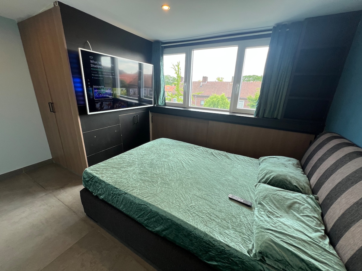 Casa acollidora en un barri tranquil, a poca distància a peu del centre de la ciutat de Tilburg. Ampli saló i dormitori, amb llit de matrimoni, dos lavabos, dutxa italiana a peu i aire condicionat. Cuina totalment equipada amb forn i microones. Pati petit amb seients a l'aire lliure, barbacoa i tennis de taula. Impost turístic a pagar a l'arribada en efectiu : 3,5% per nit.