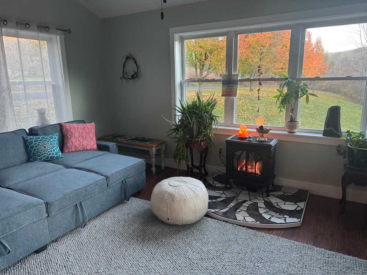 Entorn rural idíl·lic amb vistes a la vall i a un llac llunyà. Acollidora coberta per a cotxes amb terrassa envoltant i foguera: perfecta per relaxar-te i deixar-te anar. Tranquil i a prop de cascades, senders, rutes en bicicleta, cellers i sidreries. Acollidora, renovada, amb capacitat per a 6 persones, llar de foc de llenya, 3 habitacions i 2 banys. Rentadora i assecadora, rentaplats, aire condicionat. Càrrega per a vehicles elèctrics. Energia solar. A 5 minuts d'Ithaca College. A 8 minuts de Buttermilk Falls. A 10 minuts de Cornell. A 15 minuts de Cayuga Lake i Ithaca Farmers Market. A 20 minuts de l'aeroport d'Ithaca.