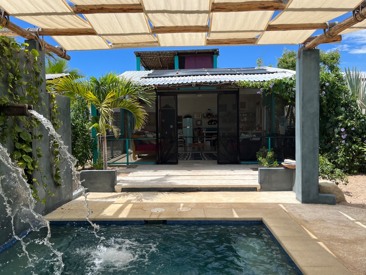 Aquest castell de tres pisos s'estén com l'edifici més alt del barri de la platja. Et despertes amb una vista de 180° a l'oceà i no pots evitar caure en un estat de gratitud profund. El dormitori superior és el Kings Suit i té un bany privat i un preciós balcó exterior amb hamaca i cuina americana. Amb vistes a la fructífera arbre de mango + palmera amb cocos, i un arbre de plumeria ple de flors quan també hi ha balenes de temporada. És increïble trobar una porció dels tròpics al desert