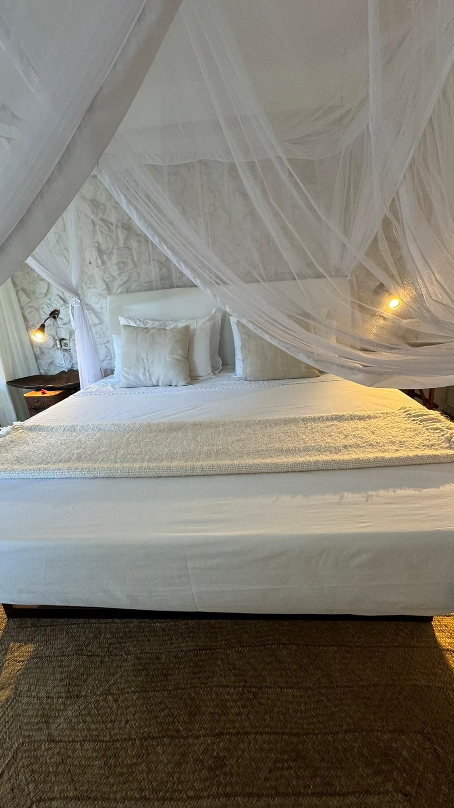 Una casa de camp airejada amb un encant rústic accessible en 4x4 amb una vista paradisíaca. Espaiós i ben equipat per a una parella en una duna plena de palmeres, amb la millor vista de la platja de Barra. Senta't en cadires de ferro o beu una beguda freda amb gel de la teva màquina de gel a la taula de l'esmorzar i contempla el rierol just a la platja de Barra, els vaixells de pesca locals i la costa nord de Moçambic que s'estén entre la neu. Meravella't amb aquesta vista des del teu llit còmode. Mirada estel·lar a la sorra de la platja davant del teu estoig.