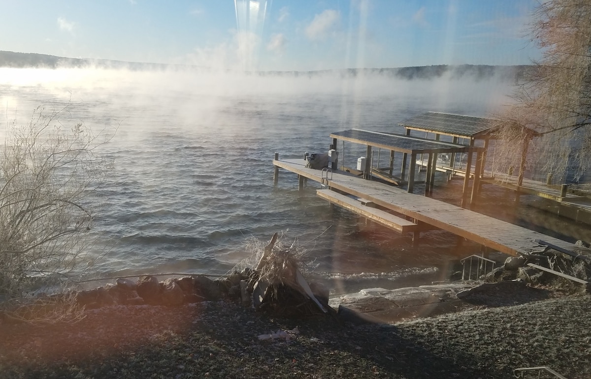 Vistes espectaculars del llac Cayuga! Casa de dues habitacions al llac amb terrasses privades i moll. A només 10 minuts d'Ithaca, l'allotjament de Cornell i Ithaca College. Situat a la Rt 89, la ruta del vi del llac Cayuga. Tots els serveis d'un allotjament de 2 dormitoris al llac. Cuina i bany totalment funcionals amb televisor de pantalla plana i wifi. Una de les terrasses més grans davant del llac amb terrasses cobertes i descobertes i una graella Jenn-Air extragrande per allotjar grups grans