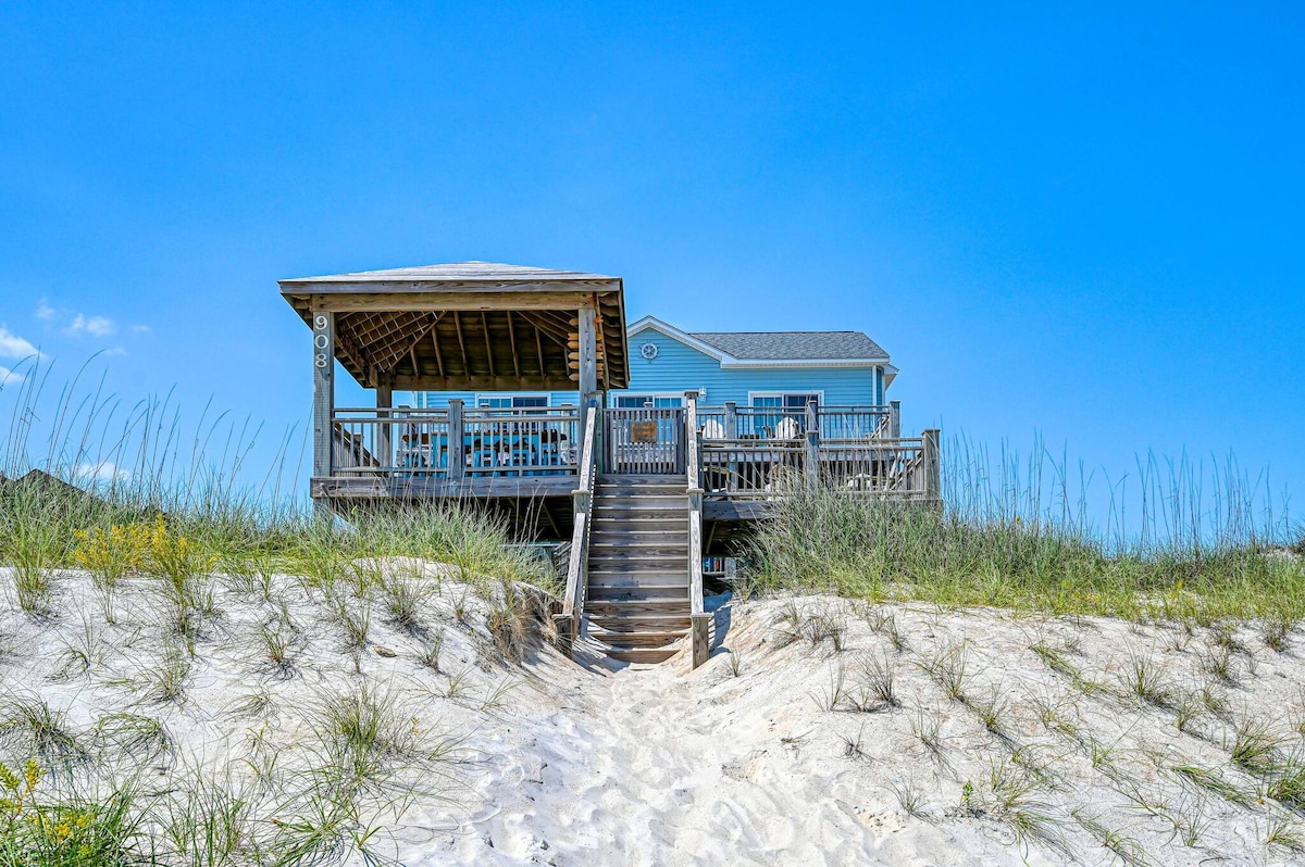 Davant de L'OCEÀ ATLÀNTIC Un carrer sense sortida tranquil a la vora de l'Atlàntic. Ningú a menys de 100 peus a cada costat de l'allotjament. Excel·lent ubicació i vistes! LLITS FETS Llençols de bany proporcionats. Terrassa coberta amb 6 cadires altes per veure la sortida i la posta de sol. Escolta les ones, observa com els pelicans i els dofins neden diàriament. Dutxa exterior amb aigua freda i calenta. Llit d'escuma viscoelàstica King a la suite principal. A 3 milles del pont Surf City. Televisor intel·ligent de pantalla gran/Roku.
