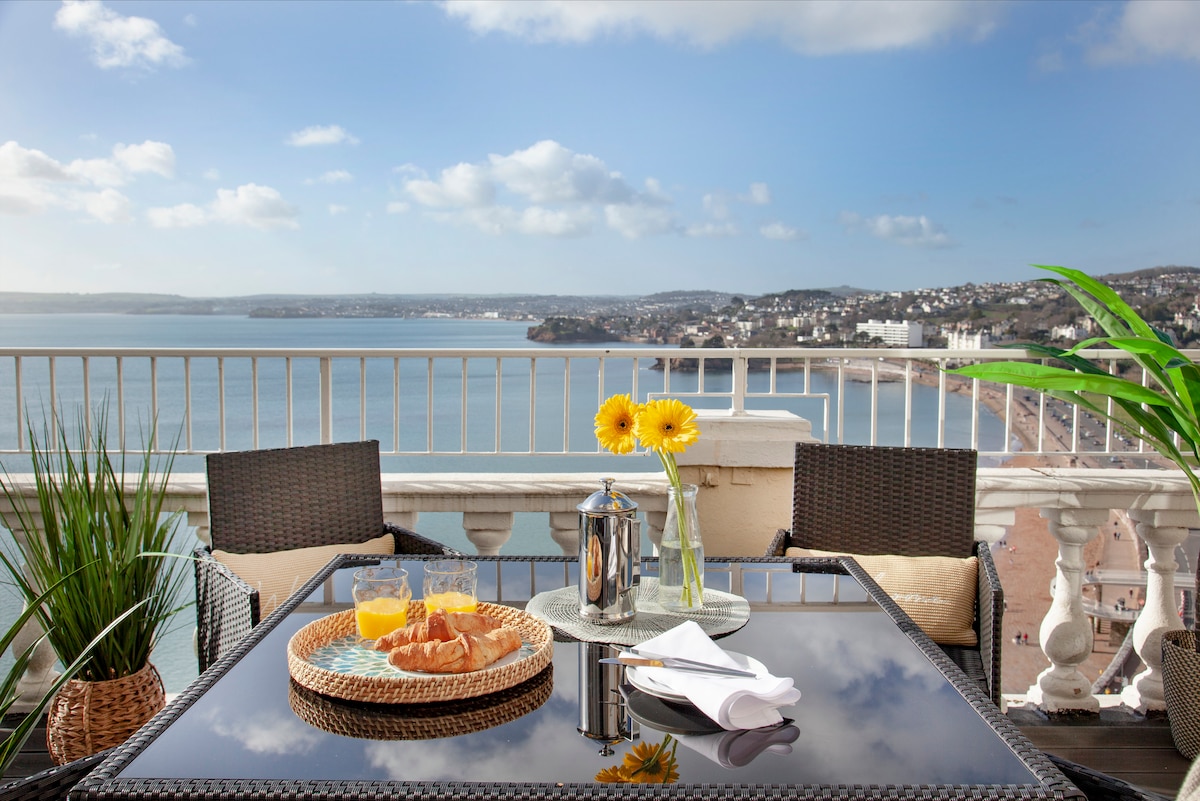 Apartament únic amb vistes a Torbay, amb impressionants vistes ininterrompudes al mar, balcó i a prop de la ciutat. Dormitori 1; portes del pati al balcó amb vista al mar, llit gran «king size» Habitació 2; llit «king size» Sala d'estar; portes del pati al balcó i vistes orientades al sud Decoració única amb cadira penjada, wifi, tocadiscs, seients a l'aire lliure i cafetera. Bany, banyera de dutxa, tovallola calefactada Cuina moderna equipada apte per a animals de companyia 5 minuts a peu per baixar a la vora del mar, pubs, restaurants, bar de còctels, ciutat