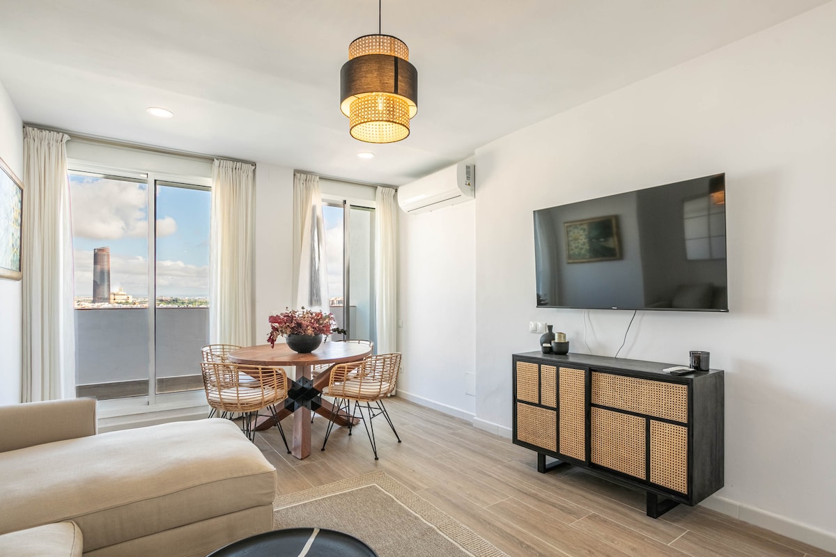 Aquest luxós pis està situat al cor de Sevilla, davant dels tres monuments declarats Patrimoni de la Humanitat per la UNESCO: la Catedral, la Giralda, l'Arxiu d'Índies i els Reials Alcàzars. Amb un disseny modern, disposa d'1 dormitori, 1 bany, una sala d'estar amb televisor intel·ligent i una cuina totalment equipada amb electrodomèstics d'alta gamma, com torradora, batedora, forn, bullidor i cafetera Nespresso. A més, té una terrassa privada amb unes vistes impressionants dels principals monuments de la ciutat.