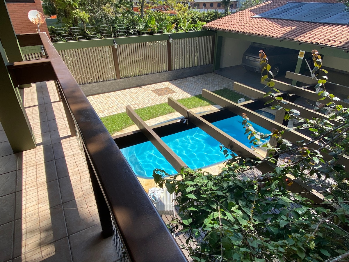 Vols passar les teves vacances en un espai tranquil, amb una zona verda increïble i al mateix temps molt a prop del centre de Torres? Llavors aquest és el teu espai. El nostre lloc es troba en un barri privilegiat de la ciutat, molt segur i a només 5 km del centre i a 7 km de la platja i de Praia Grande. Es divideix en dos terrenys, amb dues cases, piscines i quioscos totalment independents entre si, amb una entrada privada i independent, i molt d'espai entre les cases. Coneix l'altra casa: Casa Céu.