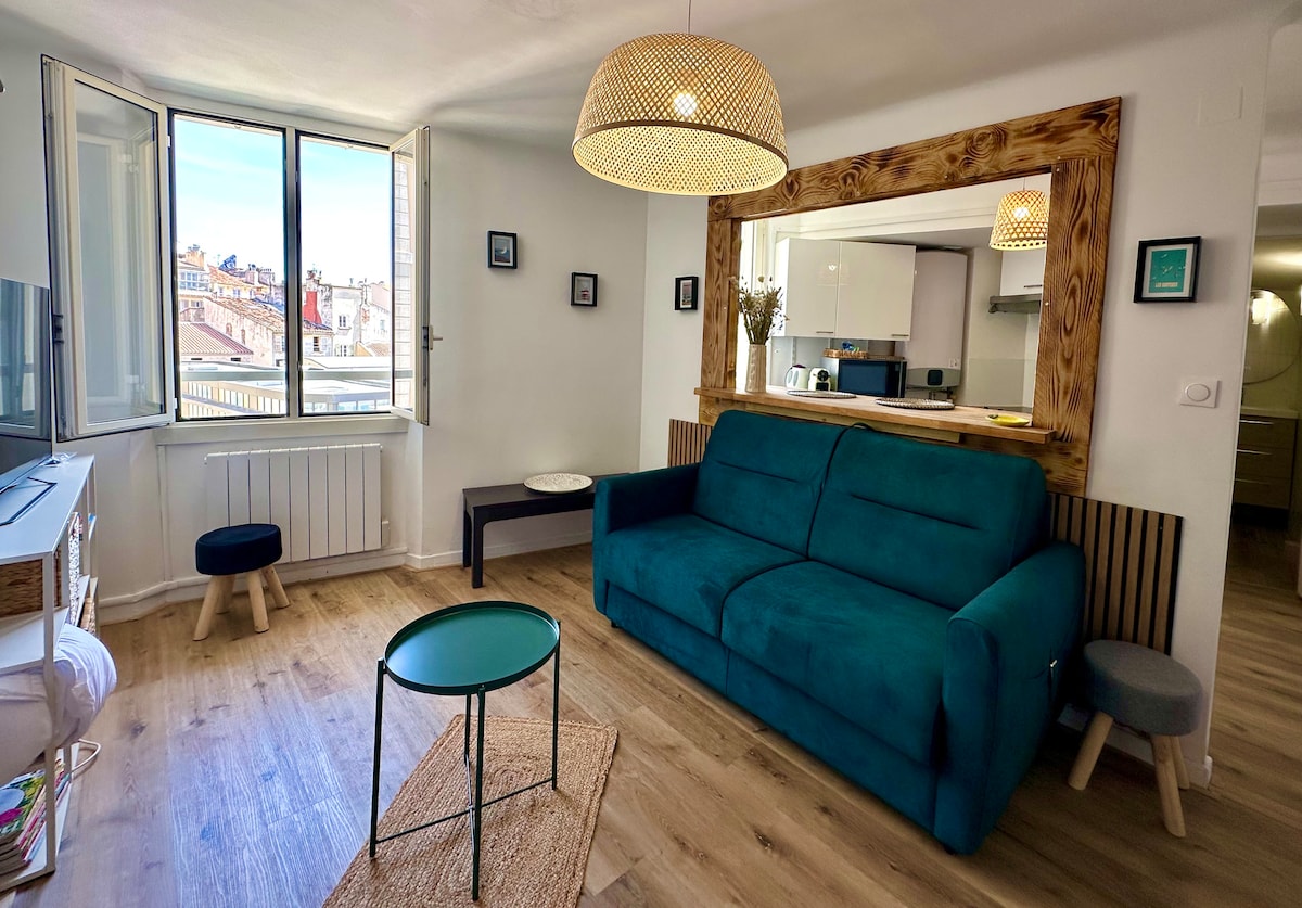 Estudi totalment equipat! Situat al centre de Toló, a la Place de la Poissonnerie, aquest estudi lluminós orientat al sud et permet gaudir d'una ubicació privilegiada a 100 metres del port de Toló. Tot es pot fer a peu o en transport públic. L'allotjament està optimitzat, tens wifi i televisió i pots accedir al teu compte de Netflix. Avantatges: ascensor, fibra.