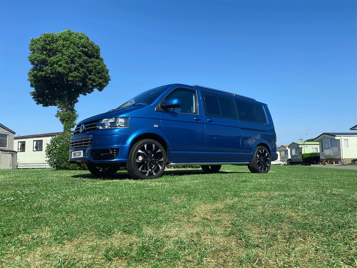 This is a beautiful blue VW Caravelle with a sporty look and feel to the the drive. The van is automatic and very easy to drive for a LWB and handles really well and drives effortlessly and very smooth. It’s had a full conversion with a kitchen and dinning area. The front passenger seat swivels to face the back area. The camper is fully equipped and comes with an electric hook up. The van conformably sleeps two with the rock n roll bed and can sleep 4 with the optional extra awning.