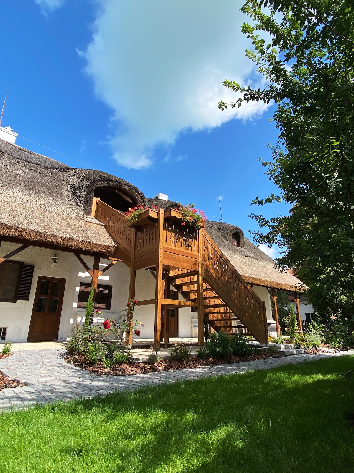 Aquest lloc tranquil i tranquil es troba al pintoresc Balatonalmadi, a la part superior de l'antiga muntanya. Darrere seu, un bosc de roures emana un aire fresc ric en oxigen, amb una experiència especial del llac Balaton i les vistes de la ciutat. La casa és de nova construcció, decorada amb una barreja d'estils clàssics i moderns, així com l'amor per la natura.