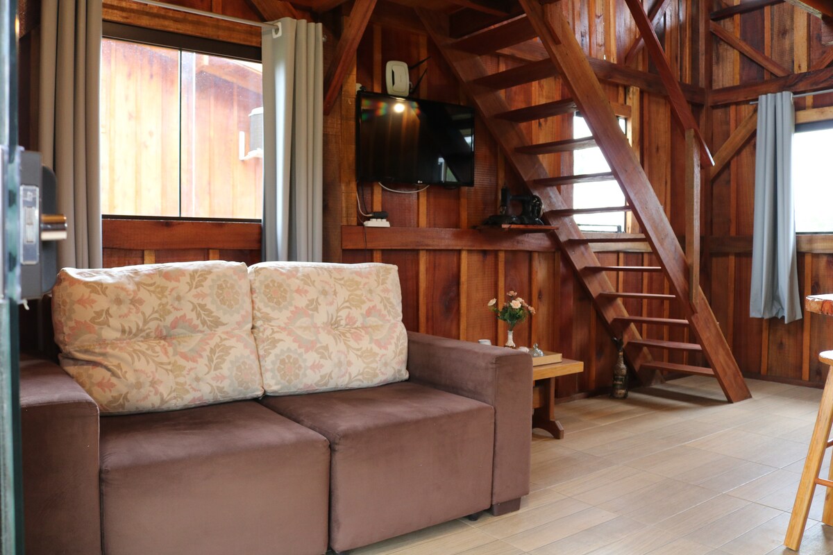 Aquest espai únic té el seu propi estil. La nostra caseta Sabiá està a les roques, una vista increïble, comoditat i comoditat! Dos dormitoris, cuina, bon hidromassatge, natura, tranquil·litat i tranquil·litat són sinònims de la cabana sabiá, lloc per connectar amb la natura i energia. A prop de la ciutat, a només 4 km, a 25 minuts de Gramado i a 3 km del centre budista. Tenim un espai bucòlic amb animals... Pracinha, cobert, cascada, gran espai a l'aire lliure, rierol...