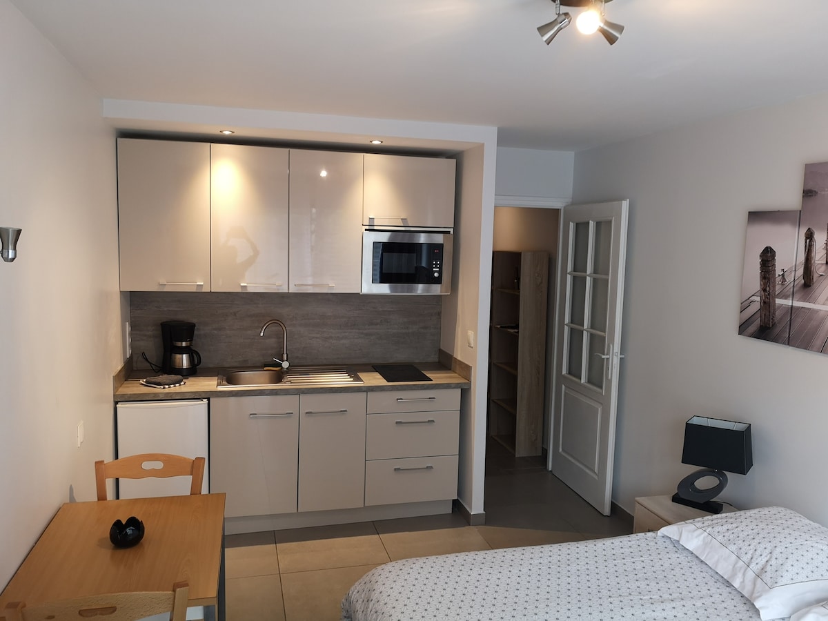 🏞️Studio bien aménagé de 30m2 proche de Chambéry. 🏆Meublé de tourisme classé 3⭐ 🛏️Lit double 140x200 Canapé clic-clac d'appoint espace salon : table basse, pouf 🛀Salle de bain séparé avec baignoire + WC 🌄Le logement est en rez de chaussée, avec une terrasse et un jardin clôturé ➡️Équipements : Frigo/Congel Combiné four micro-onde Lave vaisselle Lave linge Plaques induction Cafetière Nespresso classique ✅Draps et serviettes fournis 🔑Entrée autonome via boîte de clefs sécurisé