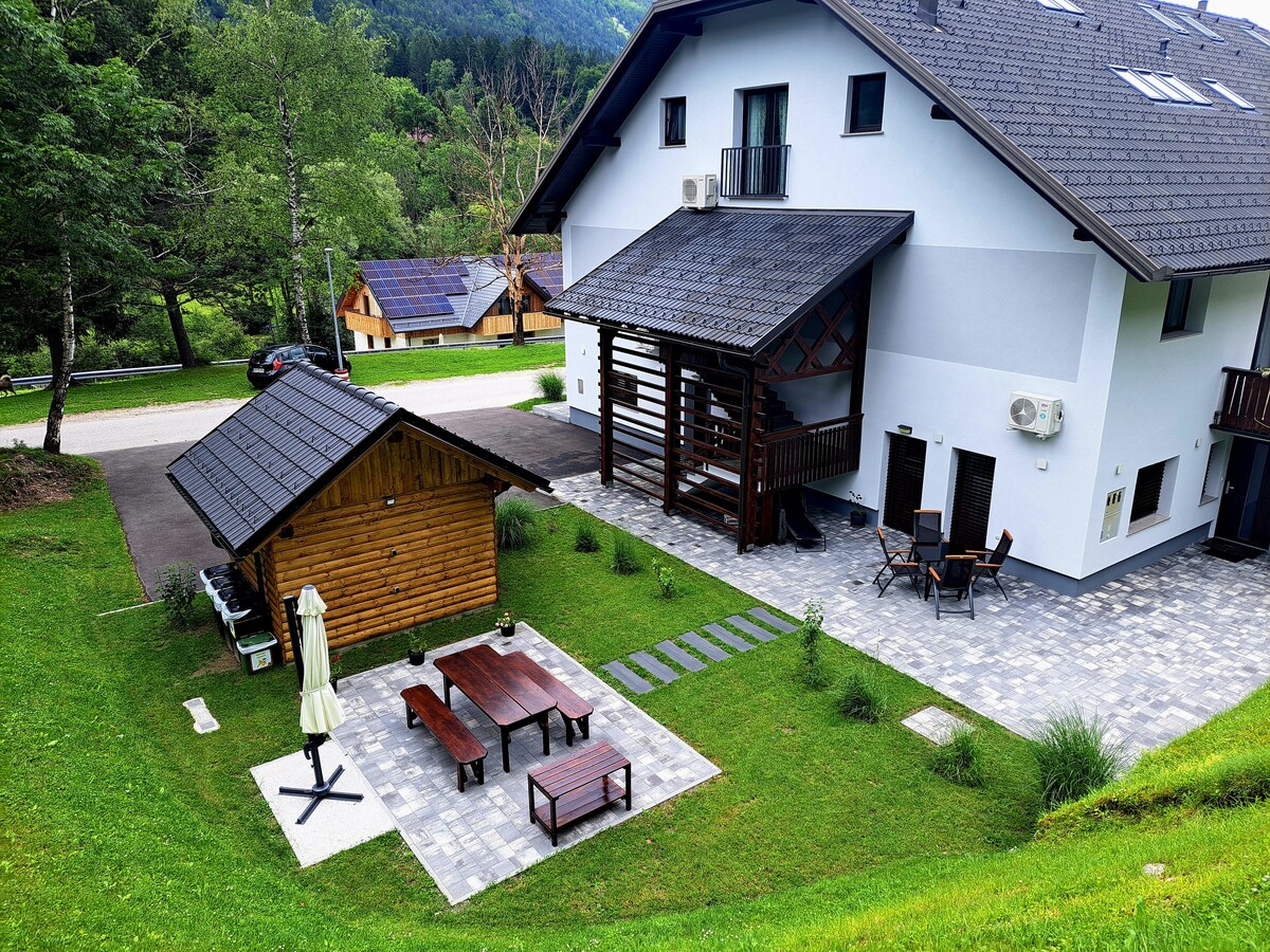El nostre apartament (100m2) és perfecte per a famílies o grups. Disposa de 3 dormitoris (7 llits), 2 banys, un ampli saló amb cuina totalment equipada i una gran vista des del balcó. Un bonic jardí gran està disponible per al seu ús. Situat a Bohinjska Bela, es troba a només 3 km del llac Bled i a 20 km del llac Bohinj i del Parc Nacional de Triglav. Tant sibusques una caminada com si vols escalar amb vistes al poble, fer ràfting o nedar, el nostre apartament és el teu punt de partida perfecte.