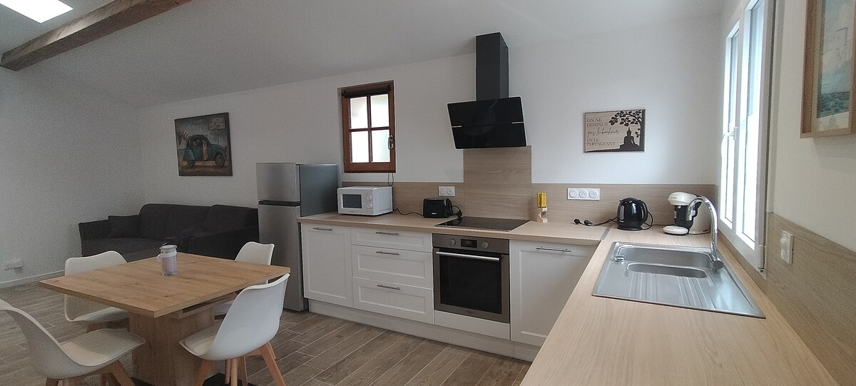 LLOGUER GITE – T3 Tranquil, a prop de Rochefort (8 km), ideal per a vacances o una escala. A la planta baixa: sala d'estar/cuina (estufa elèctrica, forn, microones, nevera/congelador/congelador, rentadora, rentadora, televisor); dutxa A dalt: 2 dormitoris ,amb 1 llit de 140 cm, vàter Terrassa privada de 25m², amb mobles de jardí i barbacoa Tovalloles de vàter i llençols Possibilitat d'1 llit amb para-sol (sense càrrec addicional) Botigues de St Agnant: pastisseries, tabac, restaurant... Per a 4 persones