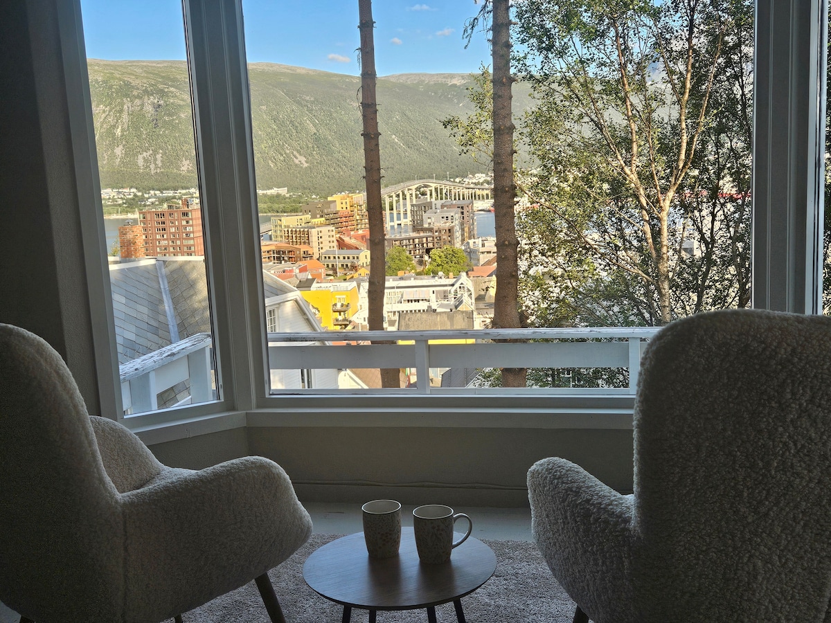 Et donem la benvinguda al nostre nou apartament estudi amb una vista increïble! Aquí pots despertar-te des del llit fins a les vistes panoràmiques de la ciutat, les muntanyes i el mar. Dormir sota les aurores boreals serà una experiència inoblidable. El pis és modern i còmode, perfecte per a parelles o hostes sols. A poca distància del centre de la ciutat, restaurants i llocs d'interès. La catedral de l'Àrtic es troba a 50 metres. L'ascensor de muntanya es troba a poca distància a peu. Relaxa't, gaudeix de les vistes i crea records que duraran tota la vida en un allotjament dissenyat per a la comoditat i els moments màgics