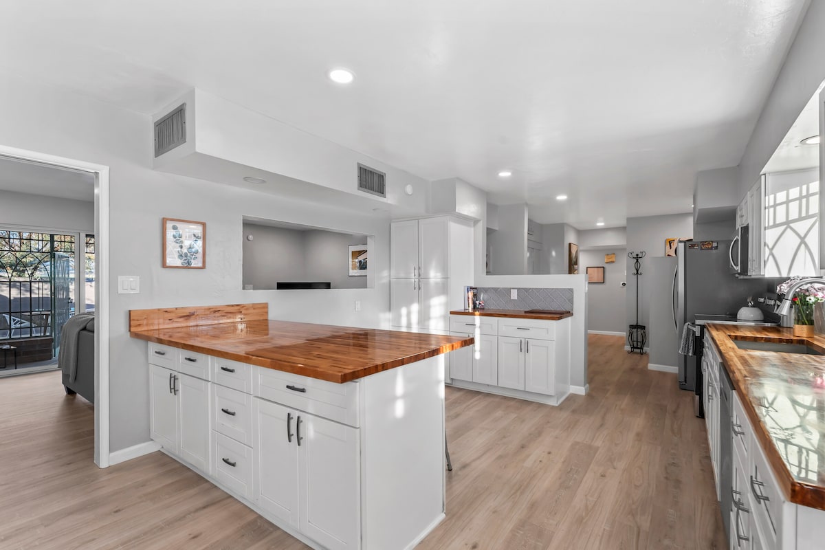 Aquest allotjament únic de mitjans de segle està situat al centre de Tucson i ofereix comoditats i molt més! L'allotjament està preparat per a famílies, amics i animals de companyia. Gaudeix de la piscina, la zona del pati amb televisor intel·ligent, graella, equipament per fer exercici, taula de ping-pong, jocs, decoració retro i característiques modernes. Els hostes poden gaudir d'un menjador formal, un gran pati, televisors a 3 dels 4 dormitoris i un escriptori amb monitor/teclat. A 10 minuts de la Universitat d'Arizona i del centre! El lloc perfecte per a la teva visita al desert!