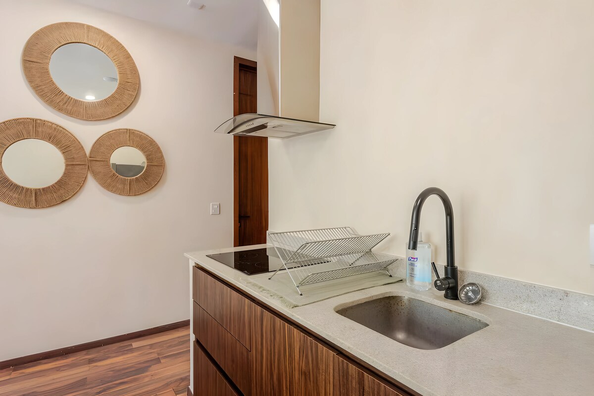 A luxurious rooftop suite in a two-unit villa, it's one of the finest in Tulum! Perfect for two people, featuring a king-sized bed, custom-made credenza, TV, a locally made mirror, full bath and a shower with rainwater shower head. Check out the fully furnished outdoor kitchen and dining area, as well as a private soaking pool from which to watch the gorgeous sunsets. It's a short walk to Tulum Centro (downtown), and only a 15-minute bike ride to the beach.