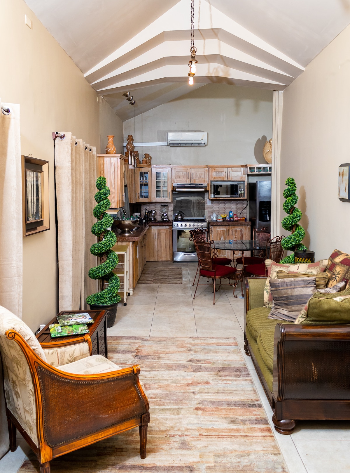 Kick back and relax in this calm, stylish space made up of two bedrooms, a full kitchen & dining area and conveniently located bathroom. Enjoy the fresh air and ambiance of the mountain view as you awake to the sweet sound of the birds chirping. Have your coffee while you enjoy the multi cultured Kois and gold fish frolicking in their pond with the sound of the water cascading down the fall.