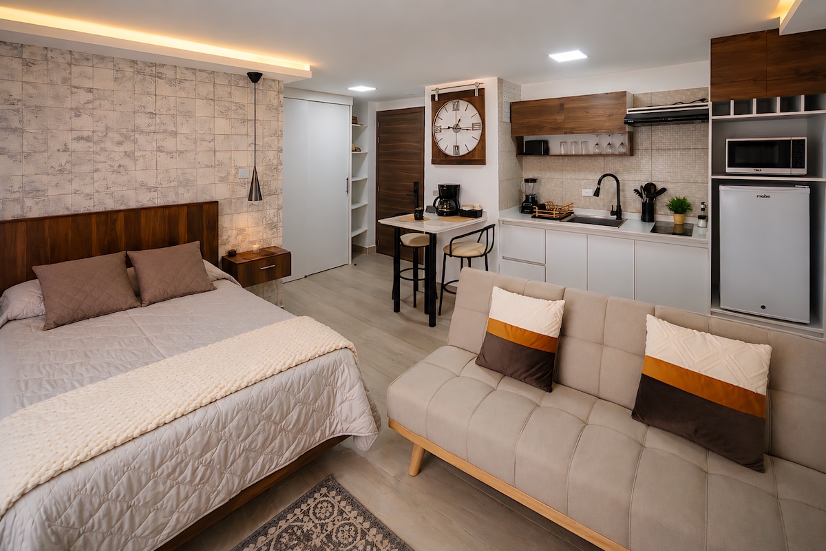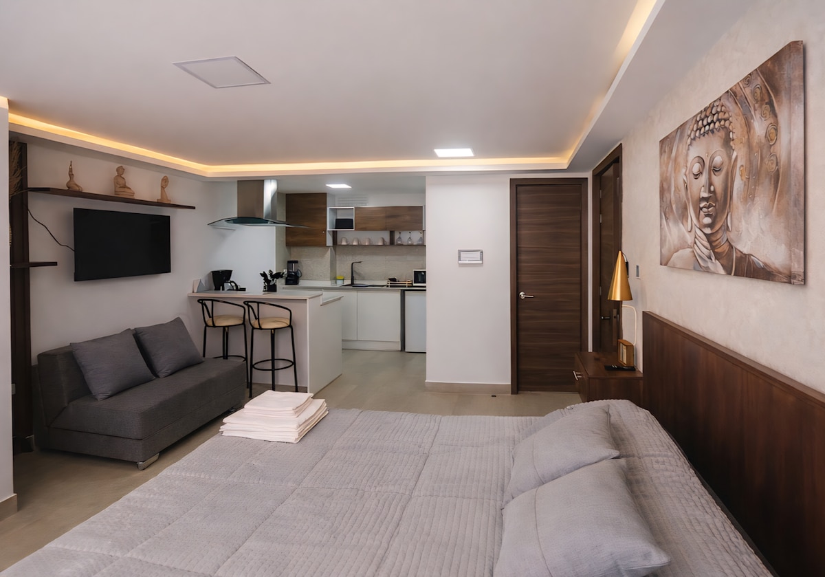 ✨ Departamento elegante y moderno en planta baja, totalmente equipado para tu comodidad. 🛏️ Cuenta con cocina completa 🍳, Smart TV 📺, agua caliente 🚿 y WiFi rápido 🌐. Mobiliario moderno con acabados de vanguardia que garantizan confort y estilo. 🧖♀️ Disfruta de una zona de spa compartida incluida, con jacuzzi, baño turco y ducha para relajarte. 📍 Ubicación privilegiada en zona comercial, a pasos del centro 🚶♂️ y cerca del terminal 🚌, con rápido acceso al polo financiero y turístico.