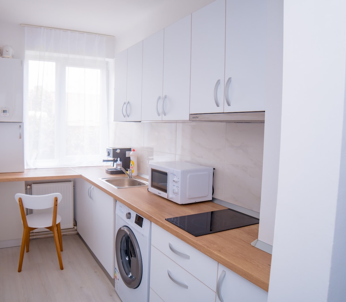 Apartament modern și primitor, perfect pentru un sejur confortabil. Dispune de un dormitor cu pat king-size, spațiu luminos și complet utilat: aparat de cafea, cuptor cu microunde și toate facilitățile necesare. Situat la doar 800 m de aeroport, oferă acces rapid și comod. Parcarea privată asigură liniște și siguranță. Ideal pentru relaxare sau călătorii de afaceri.