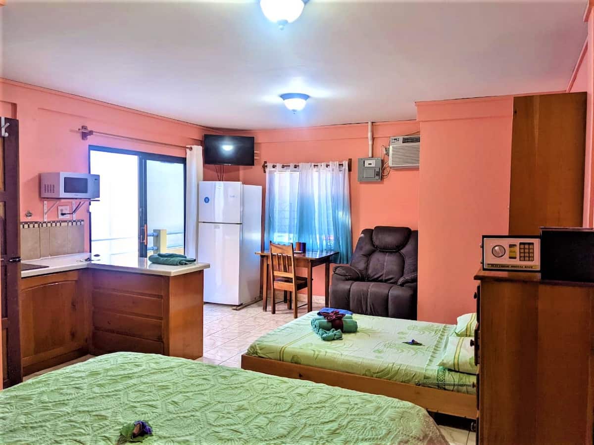 * Propietat privada tancada. * Distribució de l'estudi * Llit «queen size». * Sofà llit addicional. * Seguretat * Zona de Fort George. * Restaurants, bars, supermercats. * Piscina petita. * Aigua embotellada disponible. * A 5 minuts de la terminal de taxis aquàtics I el mar Carib. * Perfecte per a escales d'anada o tornada San Pedro o Caye Caulker. * Wifi ràpid, aire condicionat fred, dutxes calentes * A 20 minuts de l'aeroport internacional. * Taxi disponible. * Aparcament privat a l'allotjament.