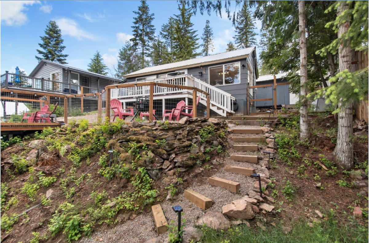 Aquesta caseta de 450 peus quadrats és bonica i acollidora, es troba tranquil·lament en un camí de terra natural, amb vistes a les muntanyes, als arbres i al llac. Ideal per a vacances en família i assequible. Només has de portar la compra! La teva mascota de bon comportament també és benvinguda. S'accedeix al llac a través d'un curt passeig de 125 peus fins a la carretera d'accés al llac amb moll compartit. La zona del moll es comparteix amb sis habitatges més. Situat a 15 minuts del parc temàtic Silverwood, a 20 minuts de Couer d'Alene/Hayden i a 35 minuts de Spokane Valley.