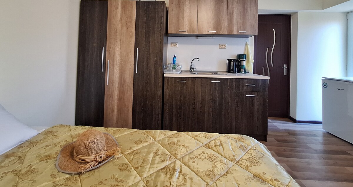 Gaudeix d'un accés fàcil al centre de la ciutat de Kavarna, a la platja local (a 3 km) i a les zones circumdants del Mar Negre des d'aquesta base d'allotjament perfectament situada. Estudi obert amb sala d'estar, cuina equipada i una zona per dormir extensible, que dona a una àmplia terrassa de 20 m². Perfecte per a una persona, còmode per a dues. Aparcament gratuït. Internet. Sense televisor. Ideal per a estades llargues.