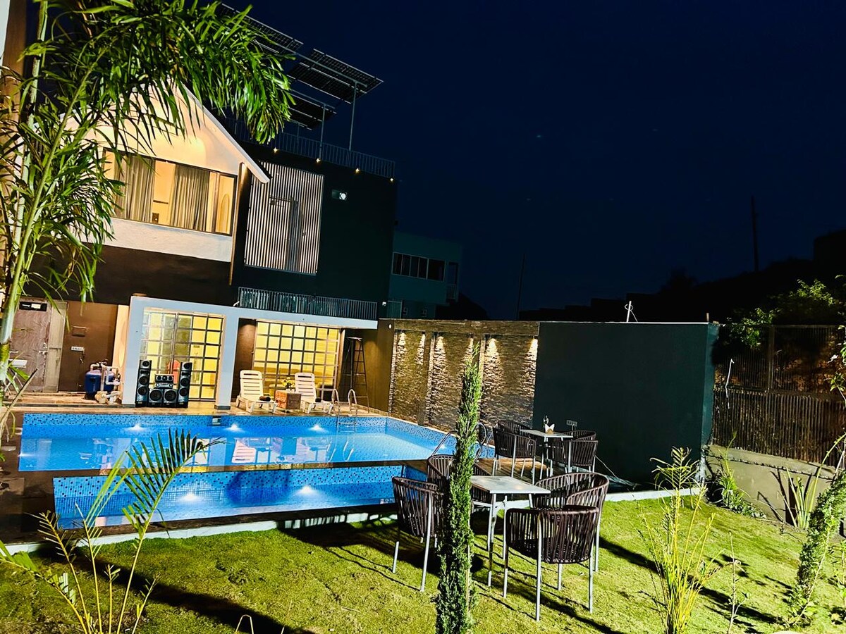 Welcome to Jannat – a luxury 2 BHK villa in Udaipur with a private pool, hill views, and peaceful surroundings. This luxury accommodation is pet-friendly and perfect for couples, families, or remote workers. Enjoy spacious bedrooms, a full kitchen, fast Wi-Fi, and total privacy. Relax in the garden or take in scenic mountain views. Book your stay at one of the best hill view villas in Udaipur and experience comfort, style, and serenity today!