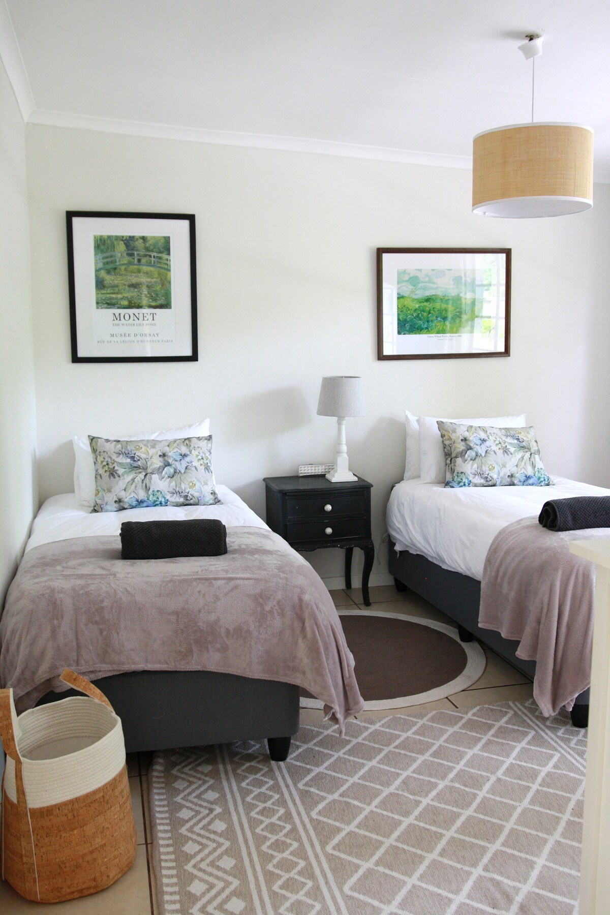 Relax, kick back or get some work done in this peaceful garden. Light the braai, and listen to the nightjar and owl calls. Well positioned in the cul de sac with 24hour guards, on the edge of a conservancy enclosed by game fencing on much of the perimeter. Feels like you're miles away from civilisation while you're just minutes from malls, excellent eateries, major highways, hiking and biking galore. Come explore, or just melt and enjoy the birdlife.