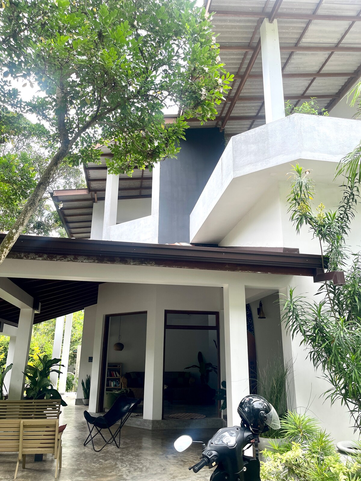 Passada una entrada discreta, una petita vil·la de luxe a la vora d'un poble. Està amagat en un petit turó en mitja hectàrea de jardí tropical verd amb una piscina de 12 m. A prop dels restaurants i botigues del Fort Galle, declarat Patrimoni de la Humanitat per la UNESCO, i a prop de les famoses platges de surf de la costa sud. L'escapada o l'amagatall perfecte per recarregar les pilotes o crear aquesta obra mestra amb la qual sempre has somiat. La casa està ben equipada, incloent-hi panells solars i piles, així que no hi ha talls elèctrics.