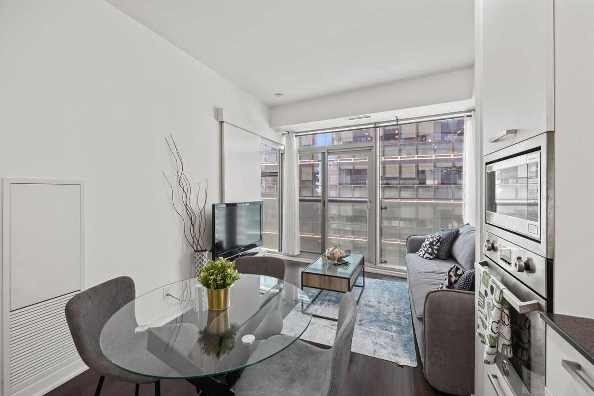 La millor ubicació de la ciutat! Apartament de luxe amb gimnàs i accés a la piscina. Ideal per a 2 persones, però pots allotjar fins a 4 persones. 1 dormitori amb llit queen + sofà llit doble a la sala d'estar. Sostres de 10 peus, cuina, taula de menjador, internet d'alta velocitat, televisor d'alta definició de 55 polzades, ascensors ràpids. Horaris de passeig; Torre CN: 1 minut. Rogers Centre - 2 minuts Aquari - 3 minuts Centre de convencions: 4 minuts Union Station: 8 minuts Scotiabank Arena - 8 minuts Ferri a l'illa de Toronto: 10 minuts. Gratuïta; Cafè i te WIFI Netflix Planxa Assecador