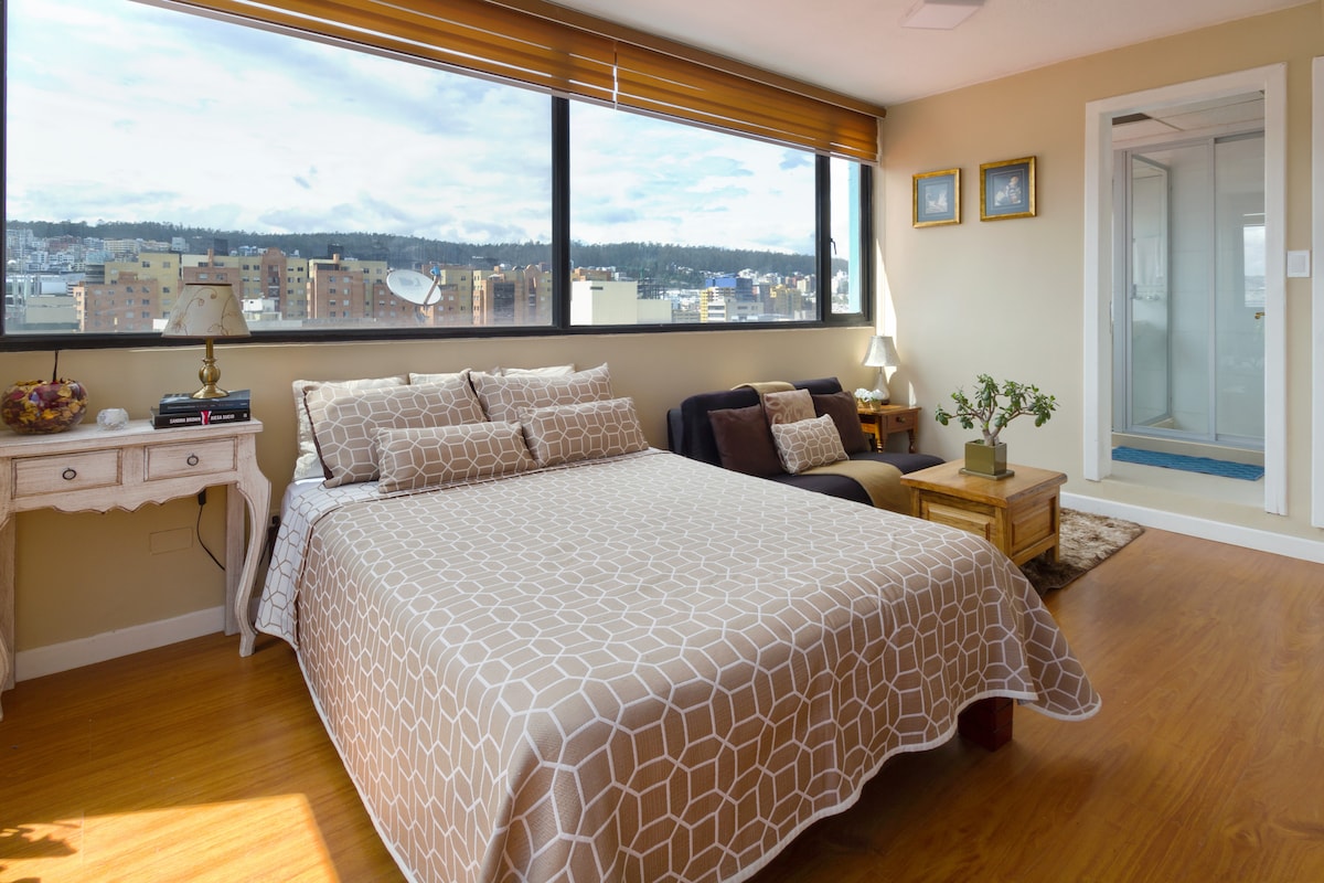 Allotja't en una suite elegant i gaudeix de les millors vistes de Quito, en un dels edificis més alts de la capital. A prop de l'estadi olímpic Atahualpa i de centres comercials Llit de 3 places, sofà llit, televisor, wifi, Netflix, cuina equipada 1 bany i mig Rentadora, assecadora, planxa. Accés al gimnàs, terrassa, parc infantil. Zones humides, zona de barbacoa (subjecte a disponibilitat i reserva amb 48 hores d'antelació) Un cop confirmada la reserva, se't demanarà un document d'identitat.