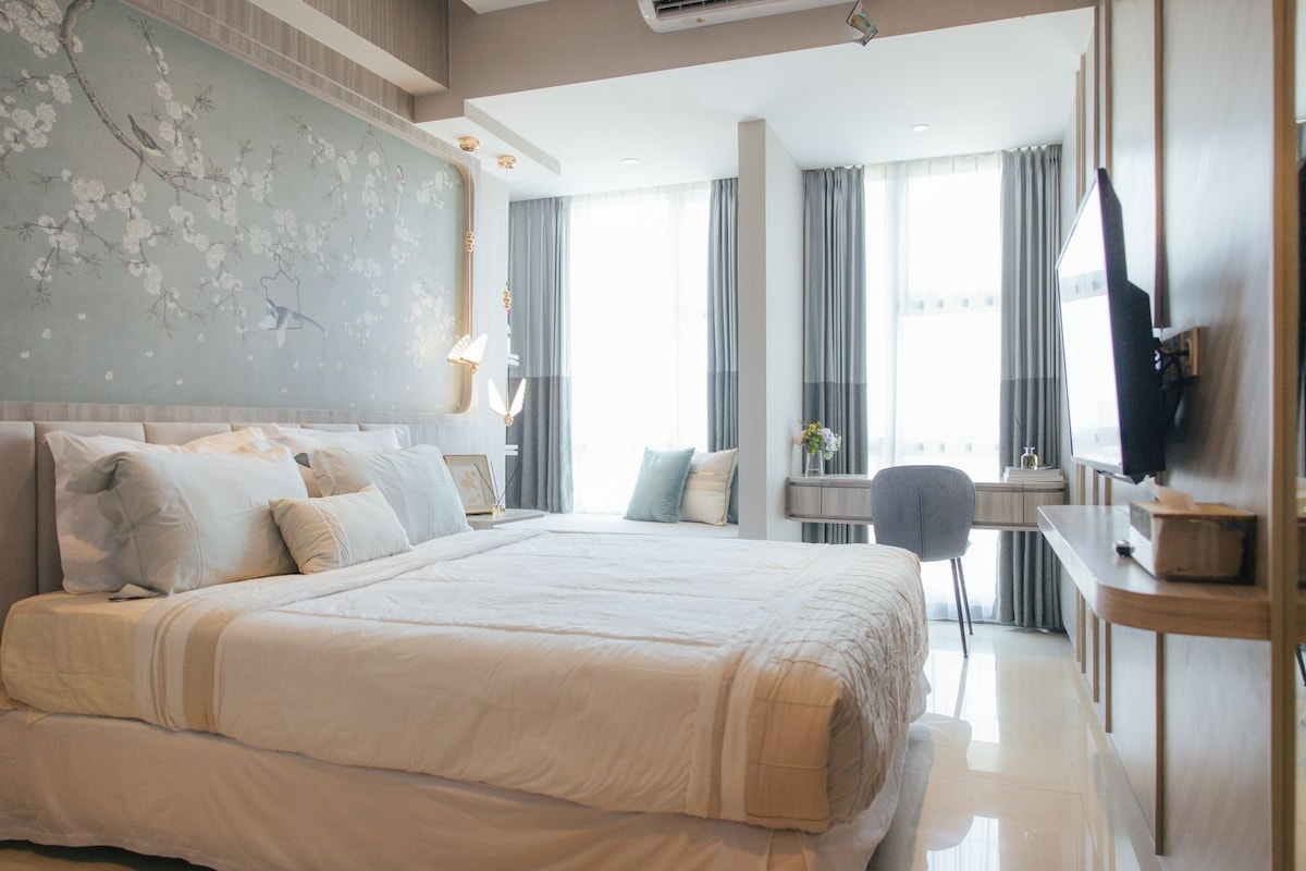 Et donem la benvinguda a DLL Home :) El nostre apartament està situat a sobre del centre comercial Pakuwon City, a la planta 12 de la Torre Amor. És una ubicació prèmium i tranquil·la a East Surabaya, amb essencial : centre comercial, escola, església, cafeteria, restaurant, cinema i altres botigues. Característiques: Llit «queen size» per a 2 persones Vista de l'habitació: piscina Escalfador d'aigua Minicocina Nevera Cafè, te i aperitius Utensilis de menjador Aigua mineral Tovalloles netes, xampú i gel de dutxa Planxa Televisor intel·ligent de 55 polzades Internet wifi Netflix
