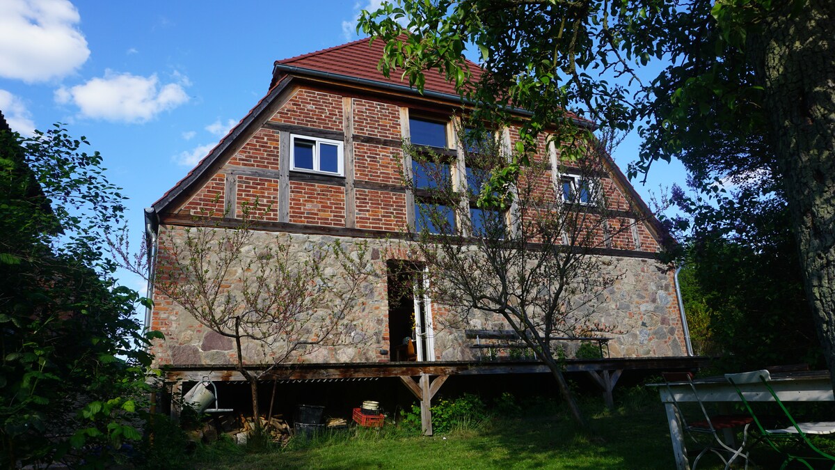Gaudeix de la pau i la seguretat d'aquestes antigues parets. Envoltat d'arbres antics al districte dels llacs de Mecklenburg. El vostre apartament es troba a la primera planta i ha estat acuradament renovat. Hem reconstruït les antigues fàbriques d'argila, vam descobrir les antigues taules del terra i només la pintura d'argila més fina va arribar a les parets. The HideAway es completa amb una petita llar de foc de ferro fos per a les nits i una sauna privada a la vora del camp ... Ens encanten els nens 🧡🌟 A la granja hi viuen 4 gats i 1 gos;-)