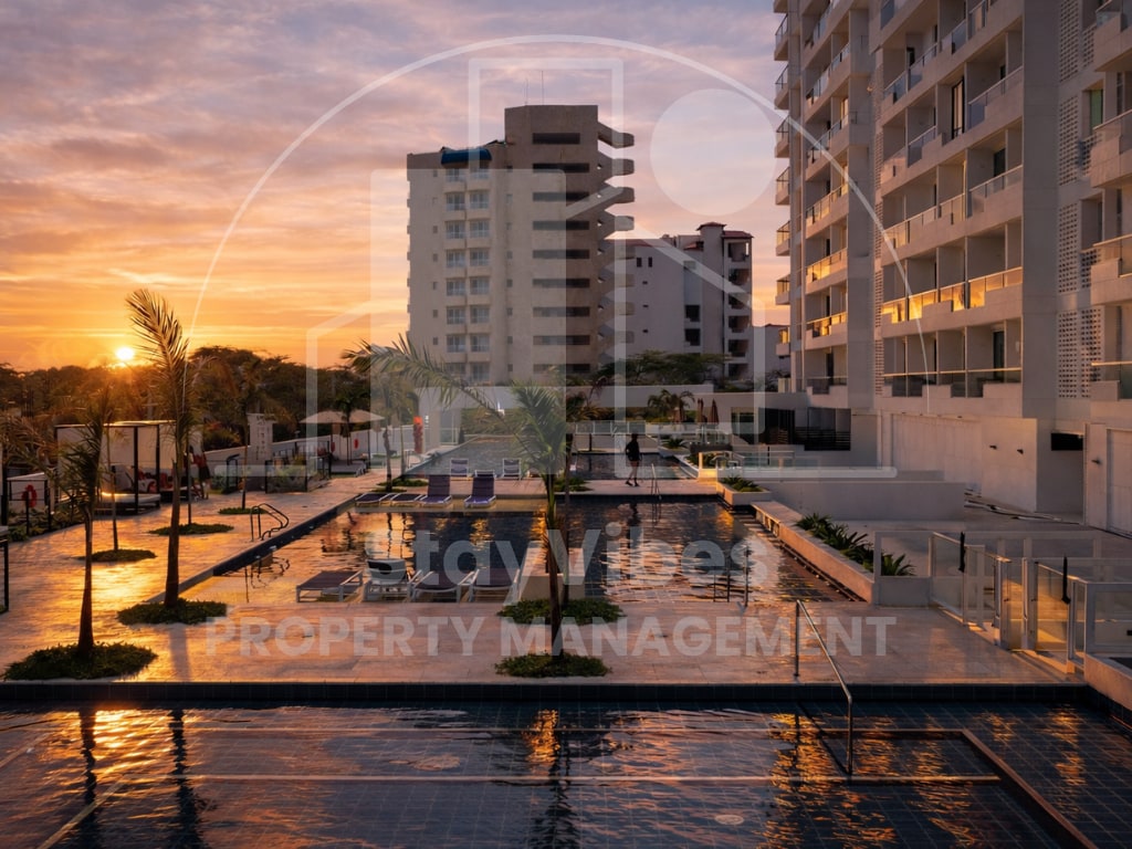 Gaudeix de la teva estada en una zona privilegiada, amb vistes laterals al mar i excel·lents serveis. Aquest espai està dissenyat per a aquells que busquen tranquil·litat i una ubicació estratègica. Una escapada romàntica o viatges de negocis. Pis estudi totalment moblat decorat amb estil de platja, wifi d'alta velocitat, aire condicionat i televisor, cuina equipada amb nevera, fogons, estris, bany privat, 3 piscines, jacuzzis, terrassa amb vista al mar, gimnàs, a tres minuts de la platja, centre comercial al costat.