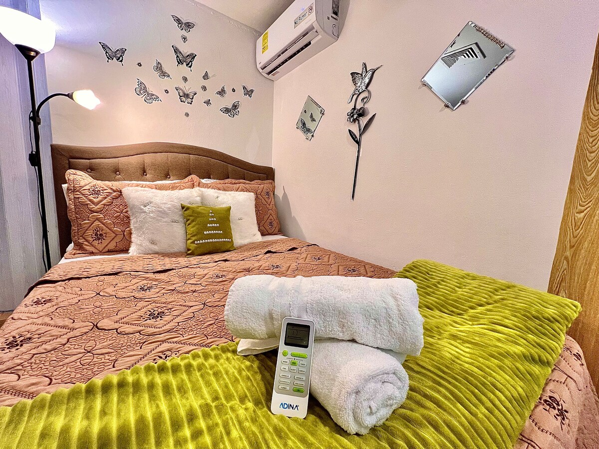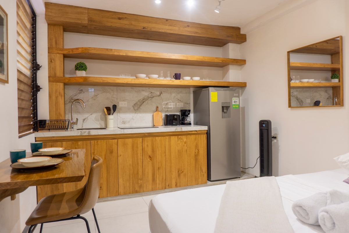 Disfruta de un espacio pequeño pero perfectamente diseñado para tu comodidad. El espacio ofrece todo lo necesario para una estancia práctica y confortable, ideal para viajeros solos o parejas. Cama tamaño full (1.35 x 1.90 m), smart TV, refrigeradora, microondas, licuadora, horno tostador, filtro de agua, cocina completamente equipada, escritorio, wifi y closet. El baño incluye ducha, agua caliente, secadora de cabello, shampoo, acondicionador, jabón, toallas y papel higiénico.