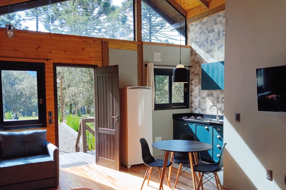 Nossa cabana é ideal para pessoas que buscam uma estadia de tranquilidade, aconchego e conforto. O ambiente integrado oferece requinte, praticidade e conexão com a natureza. Ao entrar, você será recebido por uma atmosfera acolhedora, com detalhes cuidadosamente planejados. Com o frio característico da região, o piso aquecido da cabana garante conforto térmico em todo o ambiente. As amplas janelas de vidro oferecem vistas deslumbrantes da natureza circundante, inundando o espaço com luz natural.