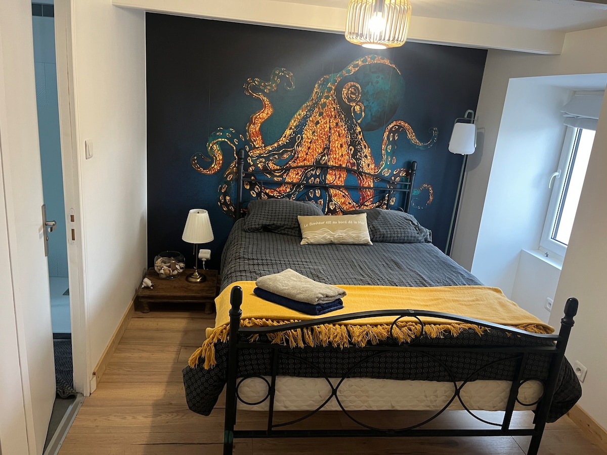 La nostra casa (50 m²/Wifi) està dissenyada per a 2 persones. (Les fotos de l'anunci les va fer un fotògraf d'Airbnb). Consta d'una planta baixa amb cuina totalment equipada i sala d'estar amb vistes al jardí/mar. A dalt: un dormitori amb vista al mar i bany. 2 jardins adjacents, un dels quals té vista al mar. Un traster per a les maletes. No vivim a l'allotjament. La Nathalie i en Gilbert seran els teus guies. ** La neteja de sortida és responsabilitat teva. Gràcies. ** La sortida abans de les 14:00 és obligatòria**