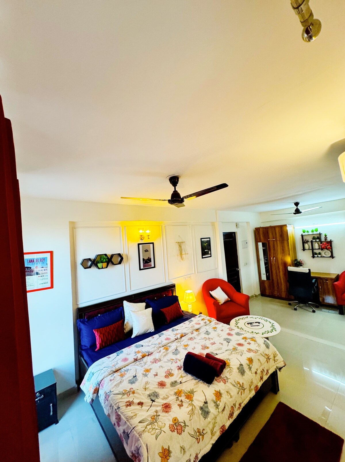 ALLOTJAMENTS BLUO: ALLOTJAMENTS higienitzats premiats! Estudi privat (450 peus quadrats) a Green Park a través del mercat principal, a poca distància a peu de l'estació de metro Hauz Khas Village i Green Park. Té un gran finestral per a la llum del sol, llit «king size», bany, escriptori de treball, sofà, menjador i cuina completa amb fogons de gas, nevera, microones, estris de cuina, etc. Tarifa diària amb tot inclòs: internet wifi d'alta velocitat, televisor TataSky, neteja, rentadora, serveis públics, aparcament, còpia de seguretat elèctrica.