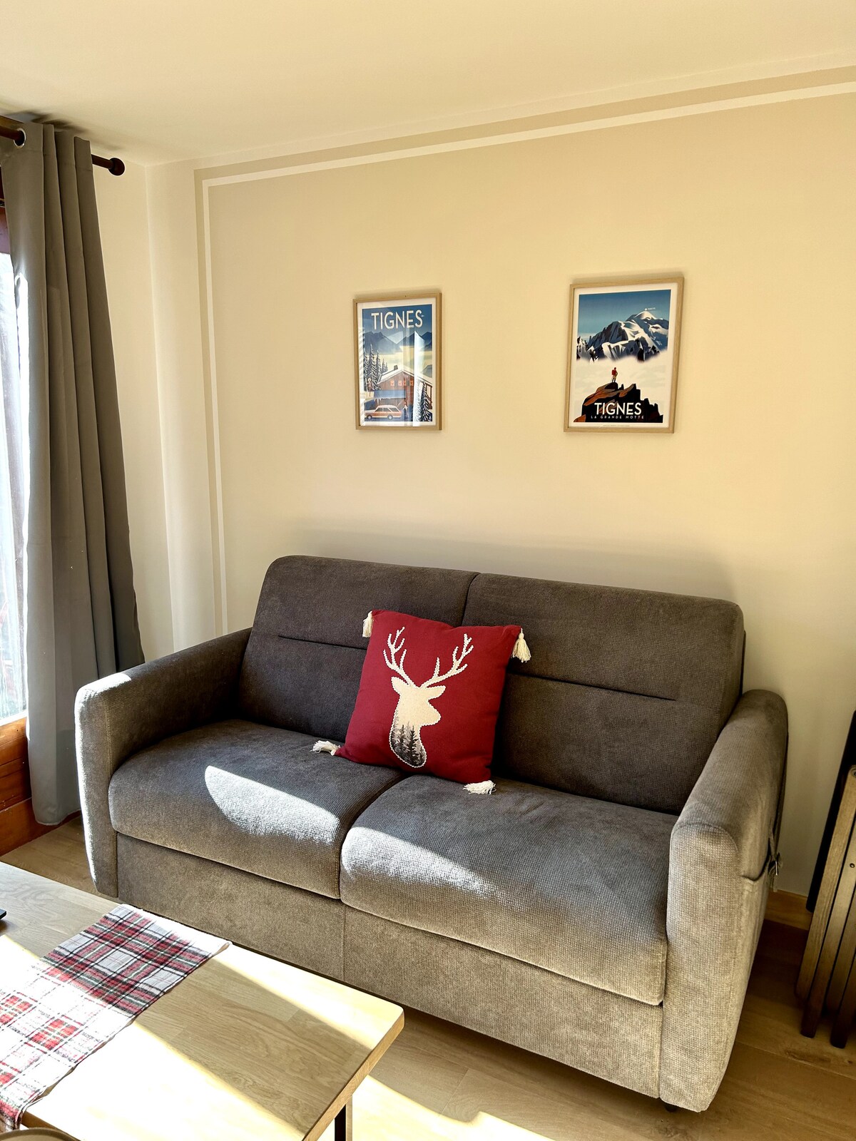 Pis amb encant i vistes panoràmiques al llac i a la Gran Motte. Valorat amb 3 estrelles per l'Oficina de Turisme de Tignes. Situat al centre del complex turístic, a 5 minuts a peu de les pistes i a 50 metres d'una parada de transport gratuïta, agrairàs la proximitat al llac i a les muntanyes. Fleca, restaurants, farmàcia i petites botigues a prop. Aparcament disponible als peus del pis a l'estiu. Ubicació tranquil·la i balcó amb vistes increïbles.
