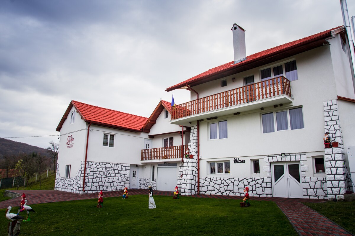The Purple Room is indulgent and opulent with vibrant purples and browns with modern amenities and stylish furnishings. This taste fully furnished room with a queen sized bed, flat screen TV, and a lovely rural view out to quiet farmland is great for relaxing. Pensiunea SilvAnka is a traditional stone and tile Villa and provides a safe, clean and luxurious base to explore the surrounding area which is seeped in history.