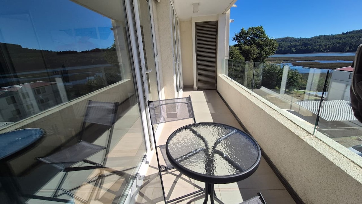 Este departamento tiene vista al Río Cruces, ubicado en Isla Teja, cercano al centro de Valdivia, a pasos de Parque Saval, restaurantes en isla teja, Jardín Botánico Universidad Austral, conexión inmediata a Puente Cruces camino a la costa y salida Norte por Puente Cau Cau. Tiene 2 dormitorios y 2 baños, uno con cama matrimonial y otro con cama nido. El condominio cuenta con piscina y muelle.