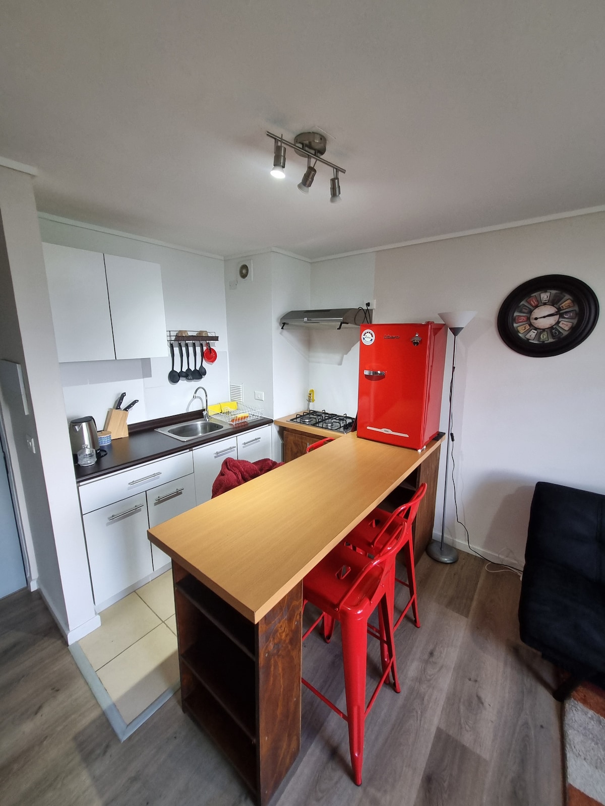Còmode, modern i acollidor, pis amb un dormitori, cuina americana, conserge les 24 hores, aparcament, consta d'aire condicionat, rentadora, dos televisors, internet wifi, dormitori amb dos llits, a la sala d'estar hi ha futon 1 plaça , perfecta per a parelles amb nens (es queda a la primera planta), capacitat per a dos adults i dos nens petits, o tres adults, amb accés directe al pati i a la cuina equipada. Ubicació de referència al centre de Pucon (a 5 minuts en cotxe). Menors de 17 anys sense cap cost addicional.