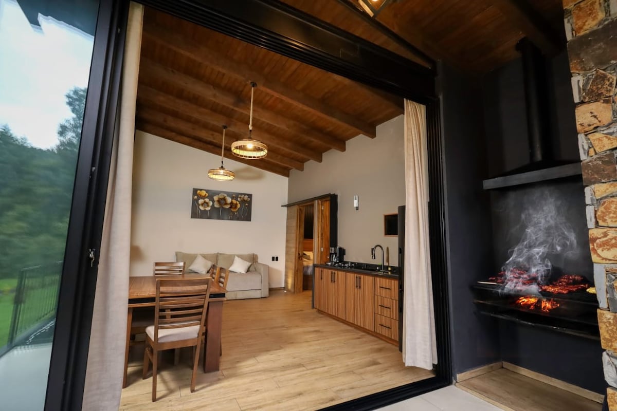 Casetes Arroyo Mazamitla (Caseta 2), perfectes per escapar de la ciutat en plena natura, a només 3 km (1,9 milles) del centre de Mazamitla. Cabana de luxe amb banyera al dormitori principal, llar de foc, cuina totalment equipada amb tots els estris necessaris, microones, minibar, fogons, cafetera, liquidadora, televisor amb cable al dormitori principal i a la sala d'estar, graella i terrassa de fusta. Wifi per a ús exclusiu a l'aire lliure (xarxes socials i correu electrònic). Perfecte per a la tranquil·litat que busques!!!!