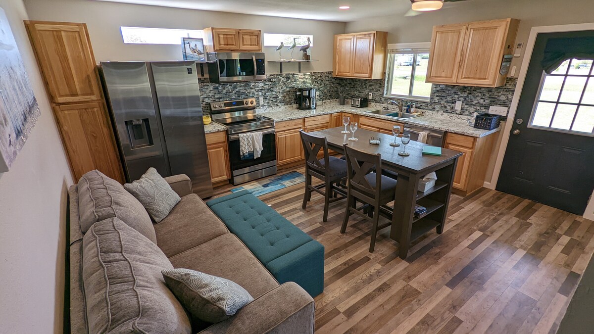 Aquest allotjament emana calidesa i un encant acollidor amb la seva decoració occidental de gust. El dormitori principal disposa d'un luxós llit d'escuma «king size» amb un cobrellit coixí suau, un espaiós vestidor i un bany privat. Cadascun dels tres dormitoris addicionals està moblat amb un còmode llit d'escuma de mida queen, també amb coixins de luxe. Per a la comoditat, hi ha un aparcament per a dos cotxes a prop del porxo lateral, cosa que permet accedir fàcilment a l'allotjament. La sala d'estar ofereix molt d'espai per relaxar-se, amb un sofà extragrande, dues cadires de pell i un impressionant televisor de 75 polzades. La cuina està totalment equipada amb un ampli espai per als armaris i electrodomèstics moderns, com ara una nevera nova, un rentaplats, una campana de forn microones i un fogó. Al costat de la cuina, la bugaderia independent/cambra de fang ofereix accés tant a la cuina com al pati lateral. Els espais exteriors inclouen un gran porxo cobert i un encantador porxo posterior amb una pèrgola, perfecte per gaudir de l'aire lliure. S'admeten fins a 2 gossos de mida mitjana o petita. Si tens un gos a casa, tapa els mobles. *** Per llogar aquest allotjament has de tenir 25 anys o més ***