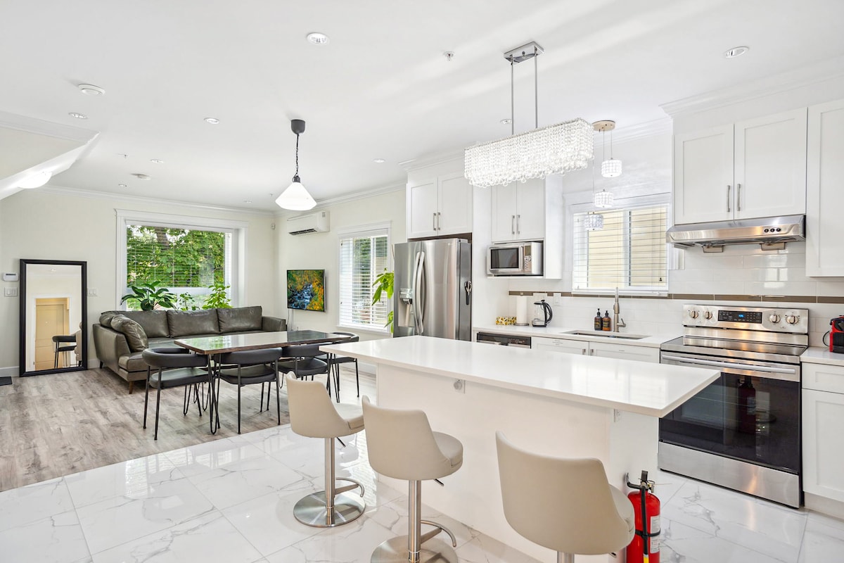 Et donem la benvinguda a la nostra casa totalment moblada a Vancouver! Situat en un barri tranquil i segur, ofereix un refugi tranquil per explorar la ciutat. Les opcions de trànsit properes fan que arribar a atraccions com YVR Outlet, Queen Elizabeth Park i Waterfront Downtown sigui fàcil. Relaxa't al nostre espai decorat amb bon gust, barreja estètica moderna amb calidesa. La sala d'estar oberta disposa de mobles elegants i grans finestrals, que ofereixen un refugi serè. Ens esforcem perquè la teva estada sigui inoblidable i encantadora!