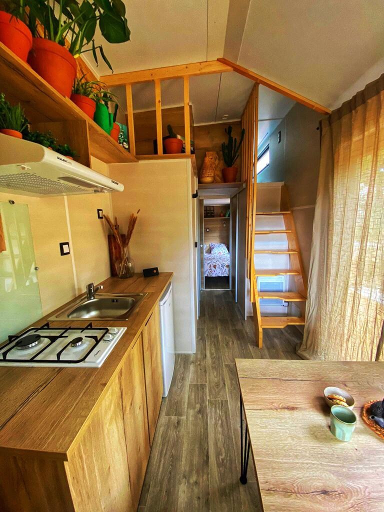 Gaudeix d'una estada única, un allotjament acollidor, una terrassa-piscina de 80m2 amb tumbones o zona d'ombra i una loggia de 20m2 sota cuirasses on podràs gaudir dels teus àpats amb total privacitat. El teu minillotjament de 28m2 amb entresòl disposa d'una zona de dormitori amb 140 llits i 2 llits infantils amb accés a escala. La cuina americana està perfectament equipada, una zona de bar és accessible a l'interior i a l'aire lliure. El bany dóna accés a una bonica dutxa italiana.