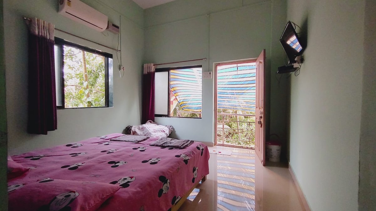 * Families preferred. No smoking or drinking. * Escape to our cozy, pet-friendly homestay in Shrivardhan, just a few minutes from the beach. The space is most comfortable for 4 guests due to a single bathroom, but we can accommodate up to 5 adults. Enjoy air-conditioning, inverter backup, TV and Wi-Fi for a comfortable and convenient stay. While we don’t offer food or silverware, our neighbours prepare tasty Konkani vegetarian and non-veg meals, which will be served in our backyard.