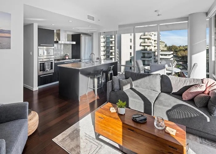 Això és per fer una reserva a l'Hotel Victòria Waterfalls. Gaudeix d'unes vistes impressionants d'Inner Harbour des d'aquesta moderna i espaiosa suite de cantonada al 15è pis al centre de Victòria amb aparcament segur GRATUÏT. A pocs passos dels emblemàtics edificis de l'Empress Hotel, Inner Harbour i Parliament. La suite disposa d'una cuina, finestrals del terra al sostre, sala d'estar i menjador de planta oberta i un generós dormitori «king size» amb bany privat. Relaxa't al balcó envoltant o gaudeix dels equipaments de l'edifici, com ara el gimnàs, la piscina i la banyera d'hidromassatge.
