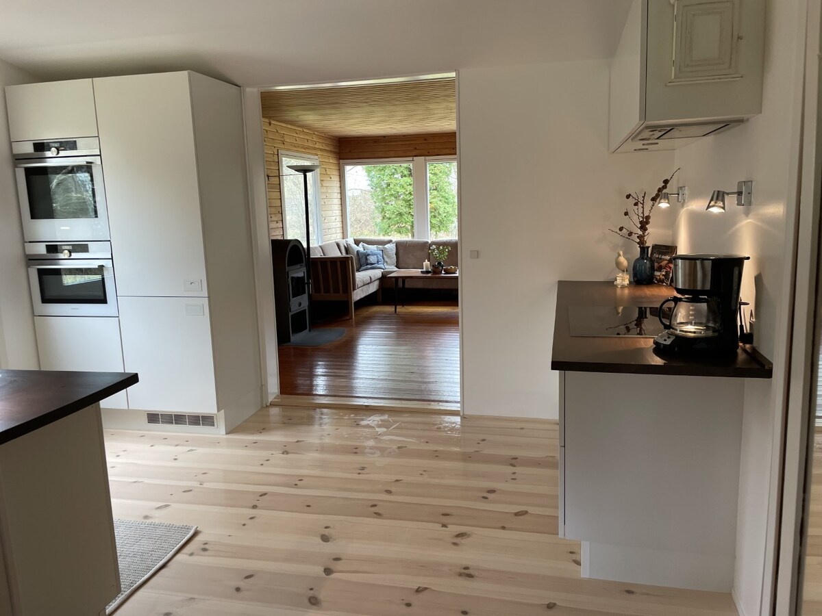 Beautiful modern cottage in the first row with magnificent views of Roskilde Fjord. High up on a hill where the fjord view all day long and the sunset is most beautiful. The house is 98 sqm and stylishly furnished with a living/dining room from which there is a clear view of the fjord. The living room has a built-in fireplace and the house contains four cosy bedrooms, a functional bathroom and separate well-equipped kitchen. From the wooden terrace there is a stair leading directly to the beach.