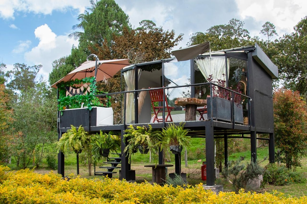 Glamping modern de doble alçada a les muntanyes de Villa de Leyva, amb meravellosos despertars i postes de sol, a 15 minuts de la plaça principal en vehicle. Si no portes vehicle, et contactarem amb taxis de la zona. Tens una habitació súper, amb 3 llits, cuina, Nevecon, menjador, sala d'estar, cadires de descans, bany, terrassa, malla de catamarà i zona de foguera privada Ens caracteritzem pel luxe i la comoditat de les nostres instal·lacions (aigua calenta, tovalloles i internet). Parc privat.